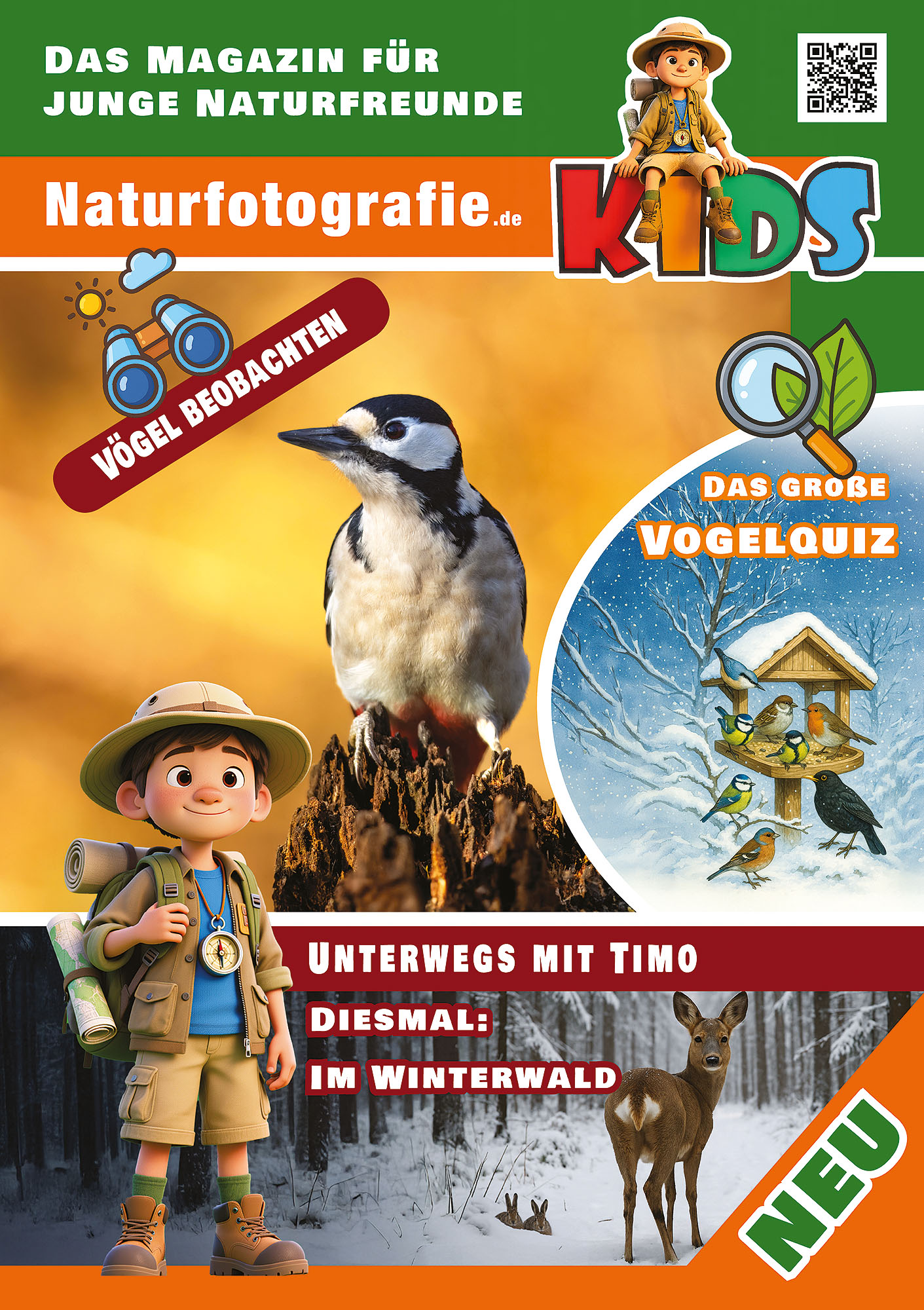 Online und als Printausgabe starten wir ab Anfang 2026 mit vielen Geschichten, Abenteuern und Mitmachideen rund um die Natur. Gemeinsam mit Timo, Nina und Felix erleben die Kinder aufregende Erlebnisse draußen und lernen ganz nebenbei, wie die Welt der Tiere, Pflanzen und Lebensräume funktionieren. Alles wird leicht verständlich erklärt, mit viel Neugier, Herz und Spaß am Entdecken.